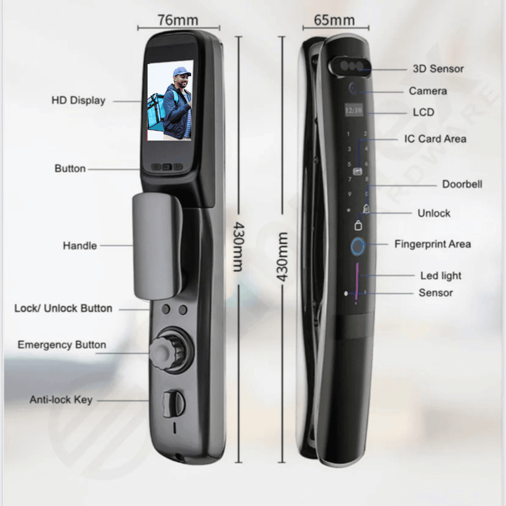 Sultan Deluxe H35 Smart Lock brings security and style to villas and apartments. Crafted with zinc alloy and a Japanese IMD screen, it offers durability and a sleek, ergonomic design. Advanced face recognition and fingerprint sensor provide fast, accurate access with multiple unlock options including password, card, app, and backup key.