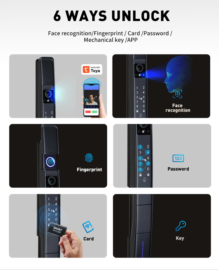Face Recognition, Password, card, key, and app unlock methods